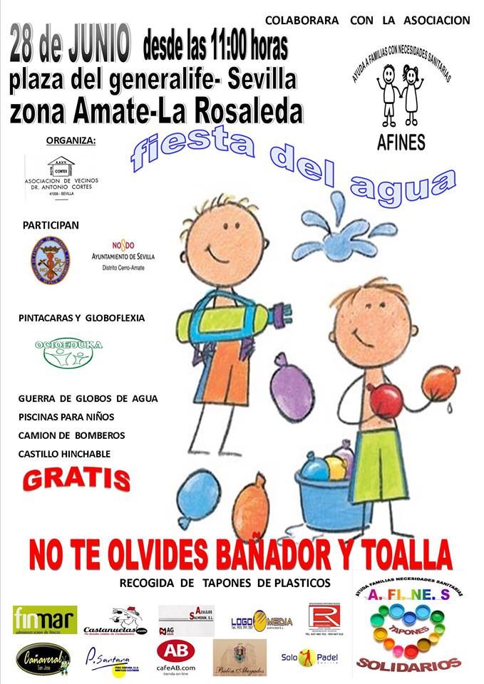 El próximo 28 de Junio desde las 11:00 de la mañana, tendrá lugar la Fiesta del Agua en la plaza del Generalife está cerca de la Avda. parque Amate, esquina con la calle General Ollero, en la barriada la rosaleda.