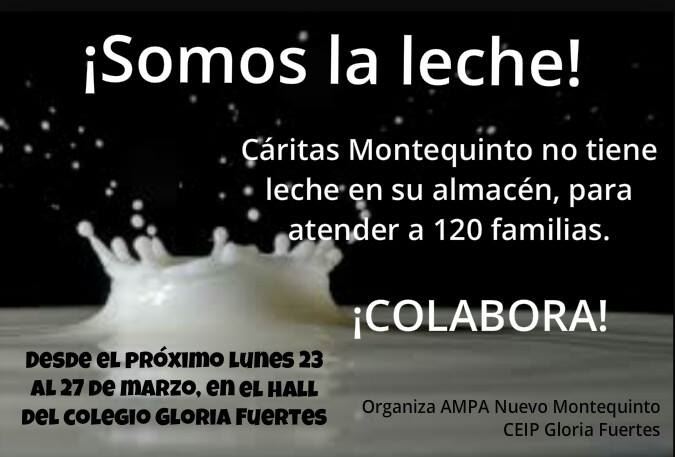 La organización de Cáritas Montequinto actualmente suministran leche a unas 120 familias quinteñas que lo necesitan, pero para poder continuar con su labor, necesitan urgentemente la colaboración de los vecinos. Por este motivo el AMPA Nuevo Montequinto, del CEIP Gloria Fuertes, ha organizado una recogida de leche que ha dado comienzo hoy mismo y que durará hasta el próximo 27 de Marzo.