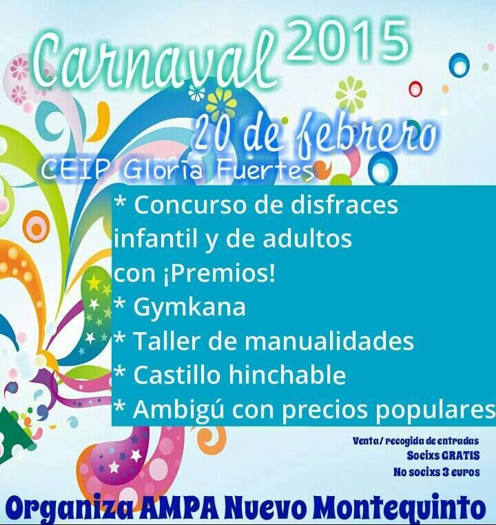 El próximo viernes, 20 de febrero, el CEIP Gloria Fuertes celebra el Carnaval 2015 organizado por el Ampa Nuevo Montequinto, a partir de las 16:30 horas.