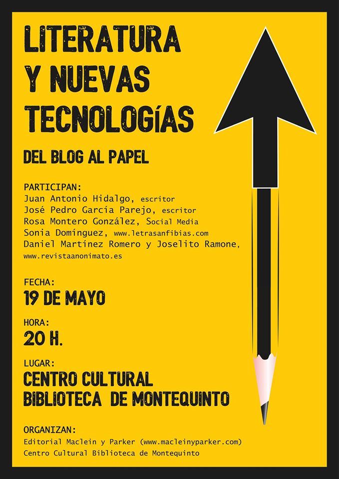 Del blog al papel’ organizada por la editorial nazarena Maclein y Parker; participarán en el debate Juan Antonio Hidalgo (escritor y crítico de cine), José Pedro García Parejo (profesor y escritor), Rosa Montero González (periodista y social media), Sonia Domínguez (periodista y creadora de www.letrasanfibias.com), Daniel Martínez Romero y Joselito Ramone (www.revistaanonimato.es).