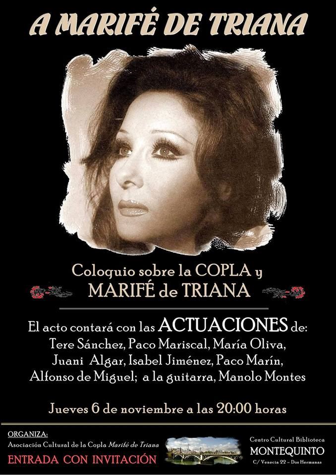 El jueves 6 de noviembre, a las 20:00 horas, tendrá lugar una Charla-Coloquio y Gala de Copla para rendir homenaje a una de las grandes de la historia de la copla. Bajo el título «A Marifé de Triana» , la «Asociación Cultural de la Copla Marifé de Triana» pretende rendir homenaje y recordad sus mayores éxitos en esta Charla Coloquio que repasará la figura de la artista. Para más tarde disfrutar de una Gala de Copla donde podremos recordar algunos de sus temas, interpretados por Tere Sánchez, Paco Mariscal, María Oliva, Juani Algar, Isabel Jiménez, Paco Marín, Alfonso de Miguel y el toque a la guitarra de Manolo Montes.