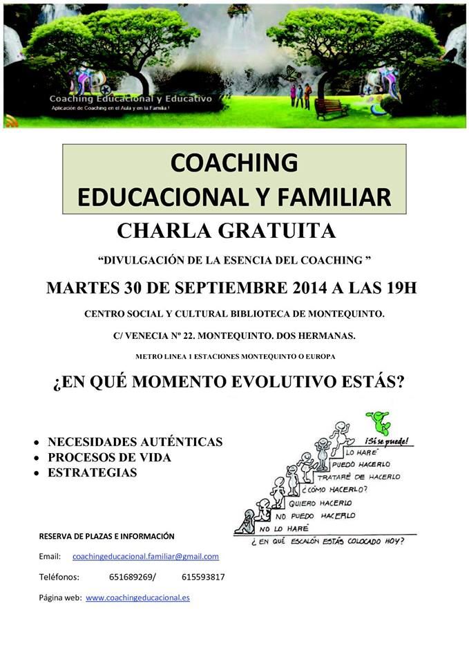 El Martes 30 de septiembre, a las 19:00 horas,en el Centro Cultural Biblioteca de Montequinto tendrá lugar una CHARLA GRATUITA ‘Divulgación de la esencia del Coaching’ a cargo de Coaching Integral Educacional&Familiar’.