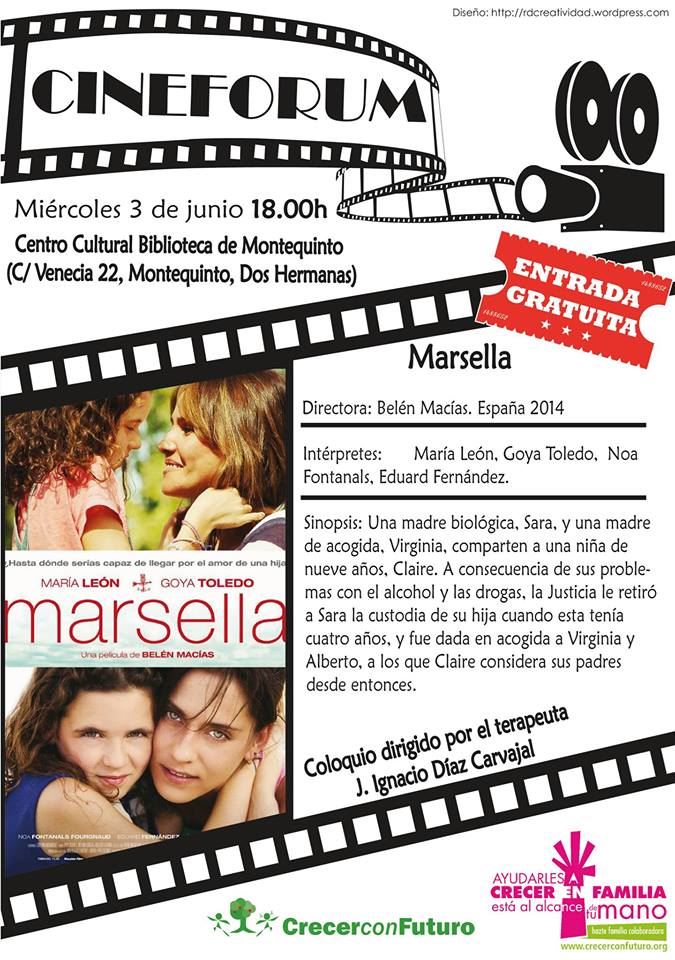 El miércoles 3 de junio, a las 18:00 horas, en la Biblioteca de Montequinto, CINEFORUM sobre menores en desamparo organizado por la ONG Crecer Con Futuro donde se visionará la película ‘Marsella’, un filme dirigido por Belén Macías.