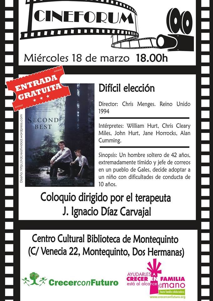 El miércoles 18 de marzo, a las 18:00 horas, en la Biblioteca de Montequinto, CINEFORUM organizado por la ONG Crecer Con Futuro donde se visionará la película ‘Difícil elección’, un filme dirigido por Chris Menges. Posteriormente habrá un COLOQUIO dirigido por el terapeuta J. Ignacio Díaz Carvajal.