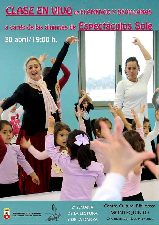 El miércoles 30 de abril, a las 19:00 horas, en el Centro Cultural- Biblioteca de Montequinto, se clausura la 2ª SEMANA DE LA LECTURA Y DE LA DANZA con una CLASE EN VIVO DE FLAMENCO Y SEVILLANAS a cargo de las alumnas de Espectáculos Sole.