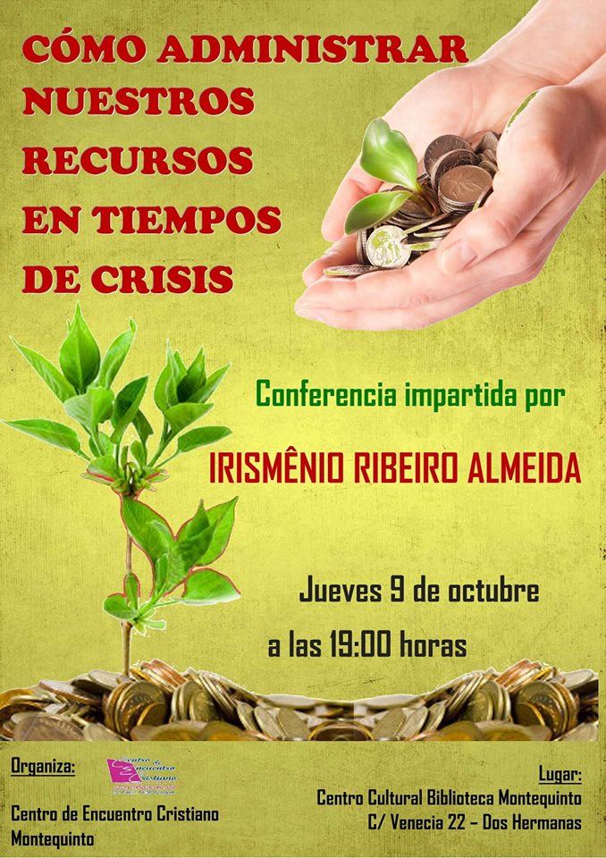 El jueves 9 de octubre, a las 19:00 horas, en el Centro Cultural Biblioteca de Montequinto, tendrá lugar una CONFERENCIA sobre ‘Cómo administrar nuestros recursos en tiempos de crisis’ a cargo de Irismenio Ribeiro Almeida (Licenciado en Administración de empresas).