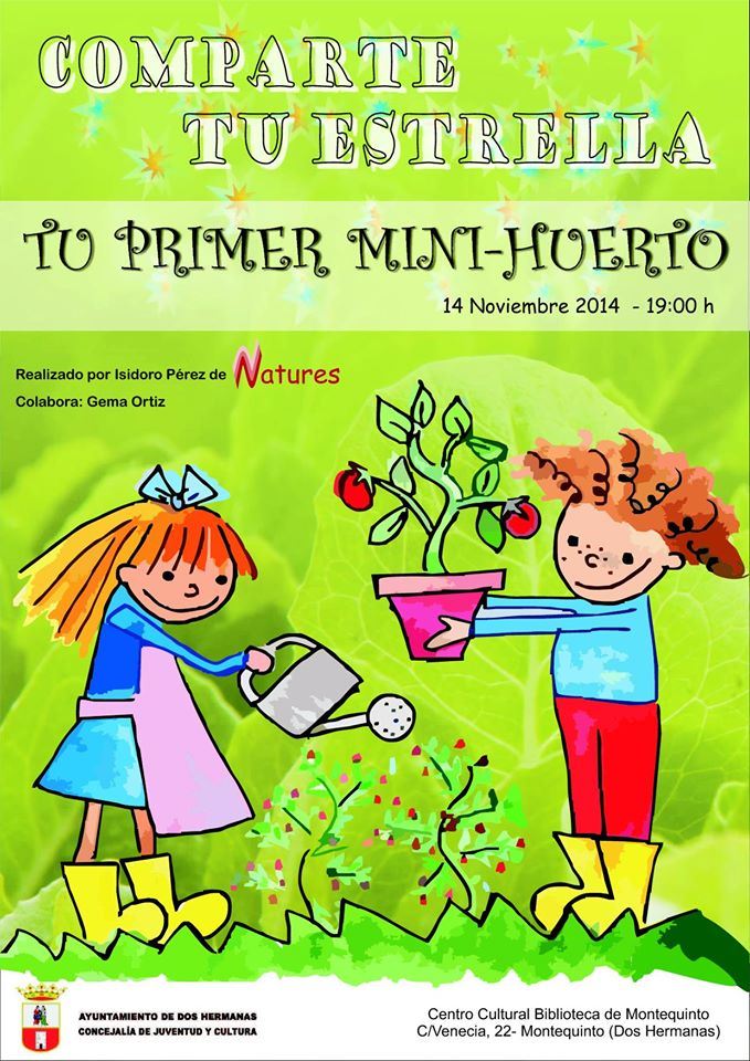 El viernes 14 de noviembre, en el Centro Cultural Biblioteca de Montequinto a las 19:00 horas, COMPARTE TU ESTRELLA presenta ‘Tu primer mini-huerto’, taller familiar realizado por Isidoro Pérez (Biólogo y Educador Ambiental de Natures) con la colaboración de Gema Ortiz (Arquitecta Urbanista).