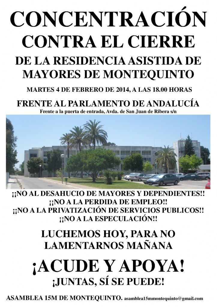 El colectivo ciudadano 15M de Montequinto ha anunciado una nueva acción para intentar dar marcha atrás a la intención de cierre de la Residencia Asistida de Montequinto. Con tal fin han convocado una Concentración en el Parlamento de Andalucía el día 4 de febrero a las 18:00 horas. Dicha acción será solo una más dentro de un calendario de acciones que se realizarán sobre todo en febrero