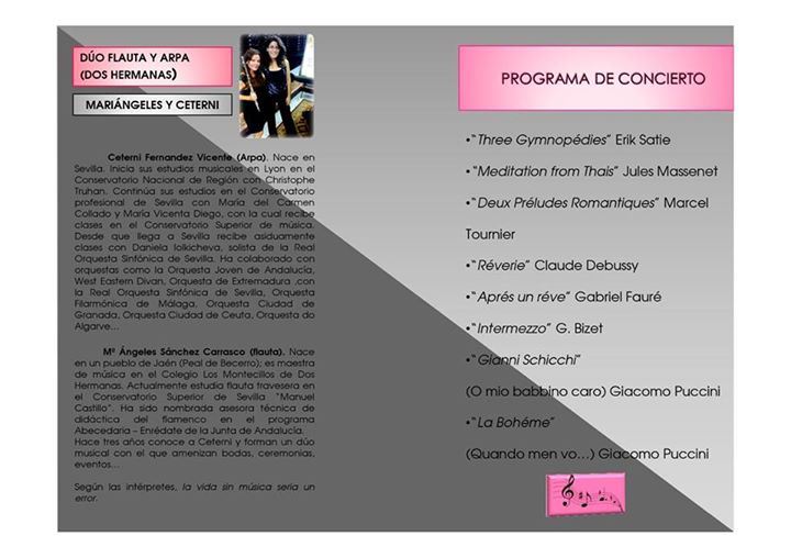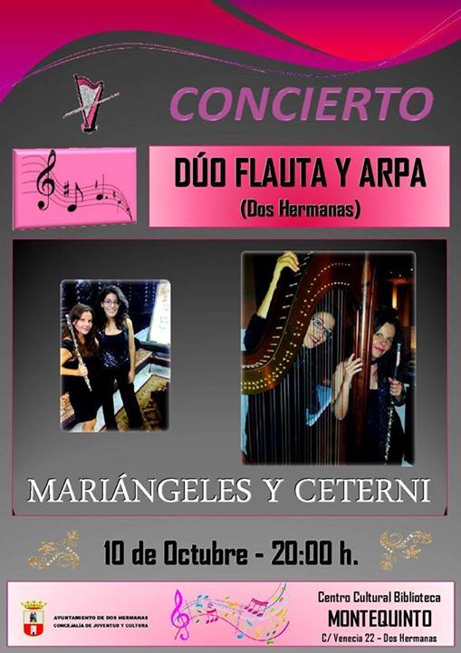 El viernes 10 de octubre, a las 20:00 horas, en el Centro Cultural Biblioteca de Montequinto, CONCIERTO MUSICAL ofrecido por el Dúo de Arpa y Flauta Travesera compuesto por Mª Ángeles Sánchez Carrasco y Ceterni Fernández Vicente