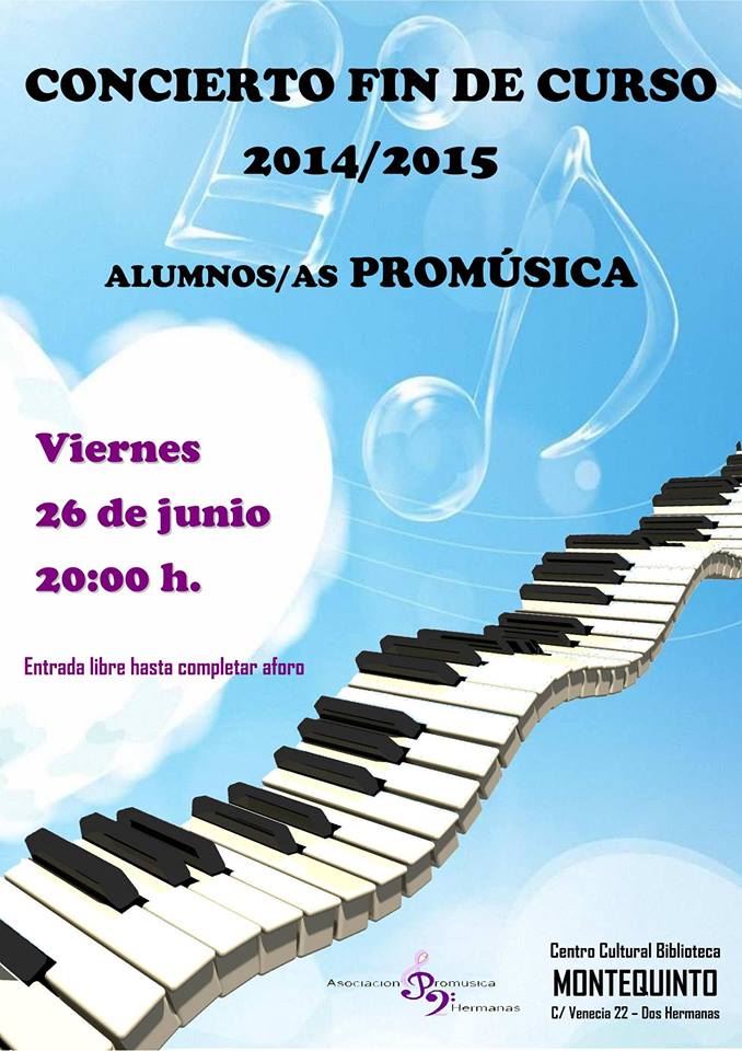 El viernes 26 de junio, a las 20:00 horas, en el Centro Cultural Biblioteca de Montequinto, CONCIERTO FIN DE CURSO a cargo de los alumnos/as de la Asociación Promúsica de Dos Hermanas.