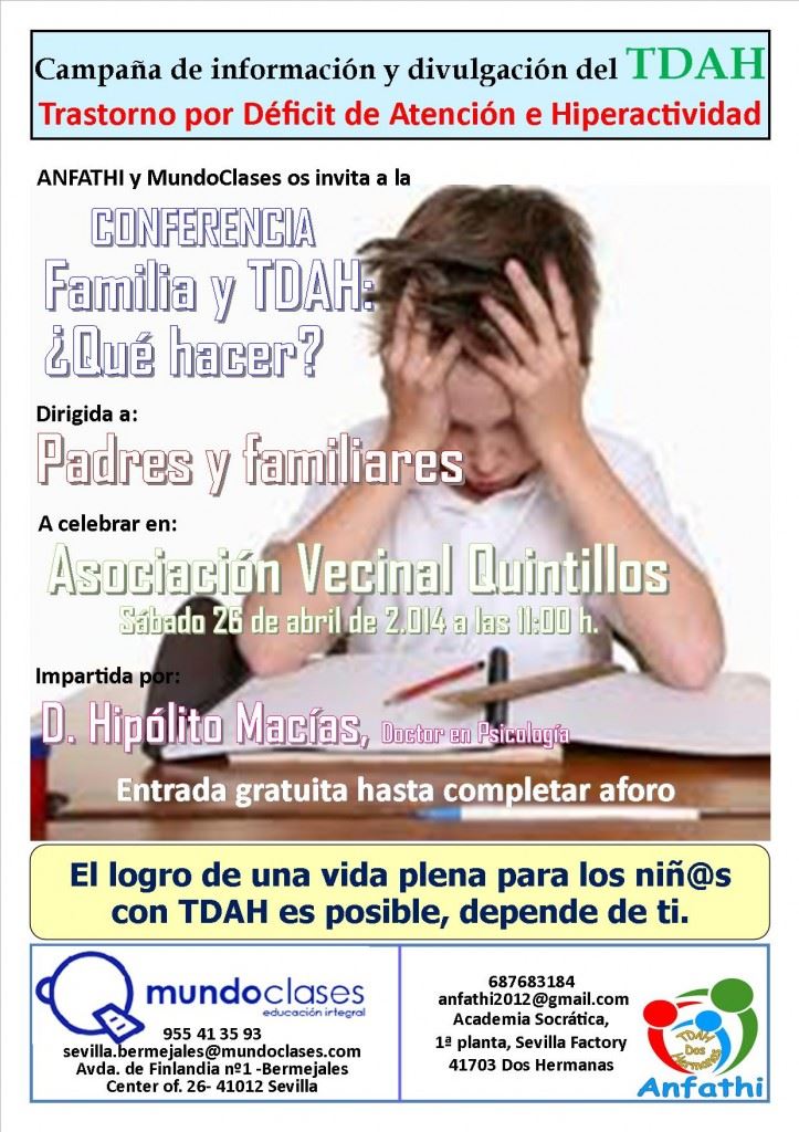 El próximo sábado 26 de abril, a las 11:00 horas, tendrá lugar la celebración de la conferencia titulada“Familia y TDAH: ¿Qué hacer?”, en el salón de actos de la Asociación de Vecinos Quintillo, sita en la calle Avda. de Montequinto de la Barriada del mismo nombre, en la que actuará de ponente D. Hipólito Macías (doctor en psicología) en la que se tratará de paliar el desconocimiento que existe sobre el Trastorno por Déficit de Atención con o sin Hiperactividad (TDAH).