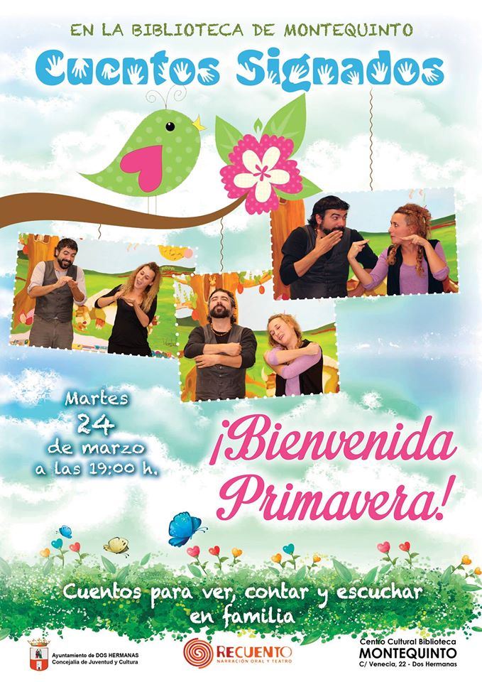 Mañana martes 24 de marzo, a las 19:00 horas, En la Biblioteca de Montequinto, CUENTACUENTOS ESPECIAL SIGNADO ‘Bienvenida primavera’, cuentos para VER, contar y escuchar en familia con Recuento Narradores.