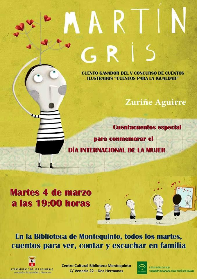 En colaboración con la Concejalía de Igualdad y Educación y dentro de los actos organizados en torno a la celebración del Día Internacional de la Mujer, Charo Torres narrará el cuento titulado ‘Martín Gris’ escrito e ilustrado por Zuriñe Aguirre Ilustración y ganador del Concurso de Cuentos Ilustrados para la Igualdad de la Ciudad de Dos Hermanas.