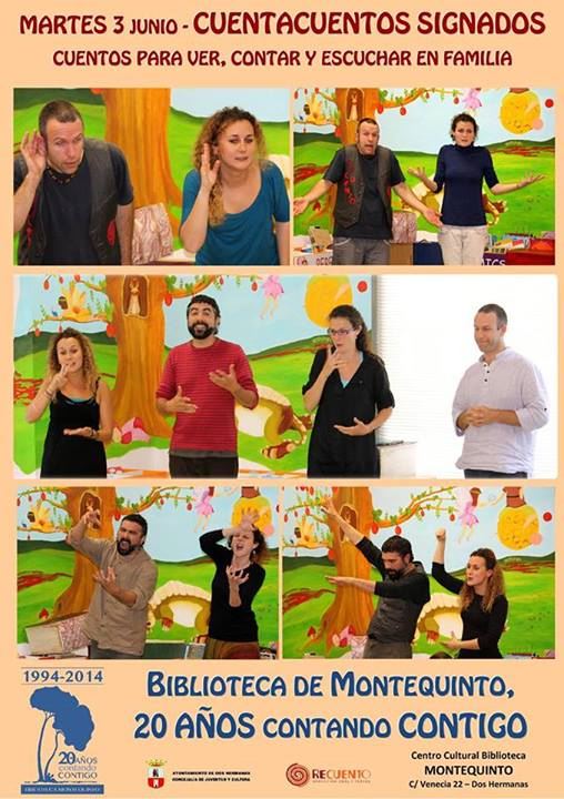 El martes 3 de junio, a las 19:00 horas, en el Centro Cultural Biblioteca de Montequinto, CUENTACUENTOS ESPECIAL SIGNADO bajo el título «20 años contando contigo», cuentos narrados por Recuento y con interpretación a lengua de signos a cargo de Julia y Lucía García del Villar.