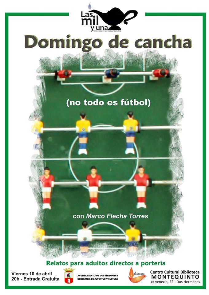 El viernes 10 de abril, a las 20:00 horas, en la Biblioteca de Montequinto, CUENTOS PARA ADULTOS con el espectáculo de narración oral ‘Domingo de cancha: no todo es fútbol’, relatos para adultos directos a portería a cargo del cuentero paraguayo Marco Flecha Torres.
