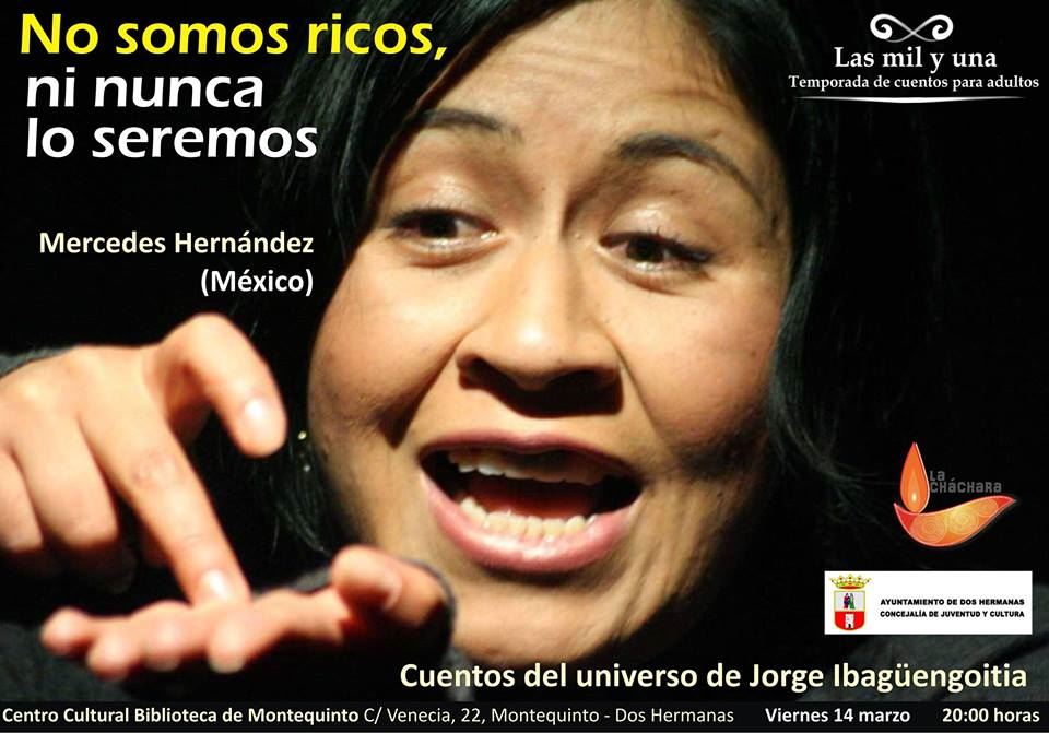El viernes 14 de marzo, a las 20:00 horas, ‘Las Mil y una’ (programa de cuentos para adultos de la Biblioteca de Montequinto y La Cháchara Narración Oral) presenta ´NO SOMOS RICOS, NI NUNCA LO SEREMOS´ espectáculo de narración oral con Mercedes Hernández, narradora oral y actriz mexicana. (ENTRADA LIBRE HASTA COMPLETAR AFORO)