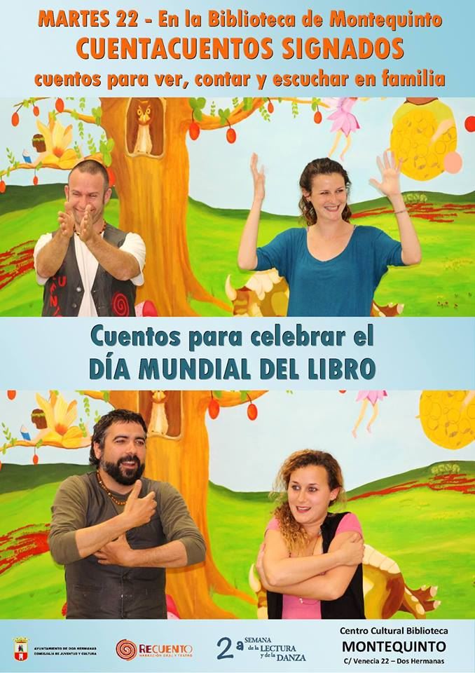 En el Centro Cultural-Biblioteca de Montequinto, tendrá lugar mañana martes 22 de abril, a las 19:00 horas, Cuentacuentos Signado, ‘Cuentos con muchos signos’, sesión especial de cuentos para conmemorar el Dia Mundial del Libro 2014 a cargo de Recuento Narradores.