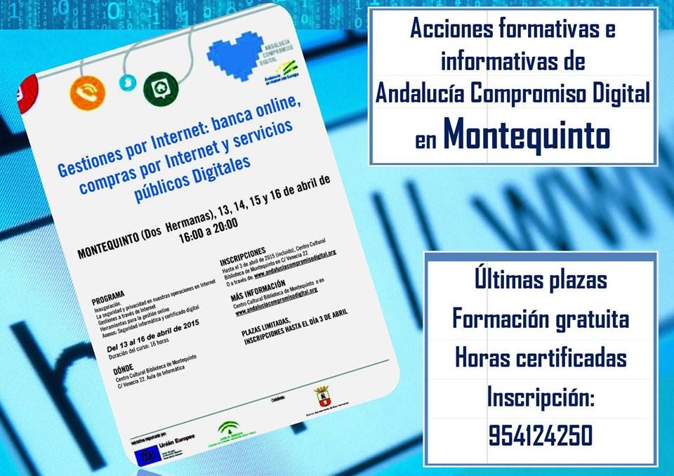 Durante los próximos días 13, 14, 15 y 16 de abril en el Centro Cultural Biblioteca de Montequinto, tendrá lugar en horario de 16:00 a 20:00 un curso de Gestiones por Internet, banca on-line, compras por Internet y servicios públicos Digitales»