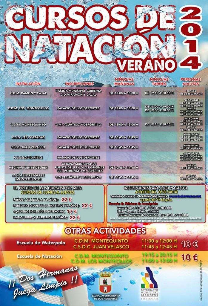 A partir de Lunes, día 16 se abre el plazo de matricula para los cursos de natación de verano en el C.D. Montequinto organizado por el Ayuntamiento de Dos Hermanas y el Patronato de Deportes.