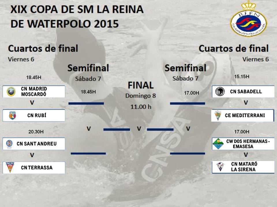 En busca de las semifinales, su techo hasta el momento en el torneo del k.o., el equipo dirigido por Javier Cortés se las verá en primera ronda contra el vigente subcampeón, en partido a partir de las 17:00 horas del viernes 6 de febrero. De sacar adelante el choque ante el Mataró, también vigente subcampeón de la División de Honor femenina, el cuadro nazareno se enfrentaría en la segunda ronda al vencedor del duelo entre el C.N. Sabadell Astralpool, defensor del título, y el C.E. Mediterrani, que abrirá el campeonato a las 15:15 horas.