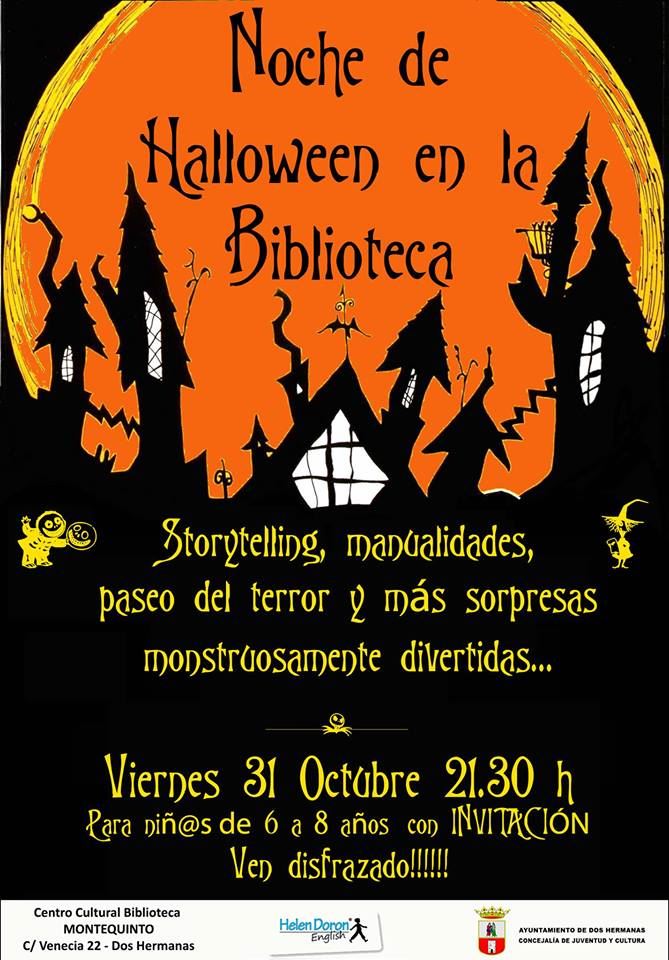 Y para que los mas pequeños, también se lo pasen «de miedo» en el Centro Cultural Biblioteca de Montequinto, a partir de las 21:30 horas, NOCHE DE HALLOWEEN EN LA BIBLIOTECA, una fiesta terroríficamente inolvidable organizada en colaboración con Helen Doron Montequinto.