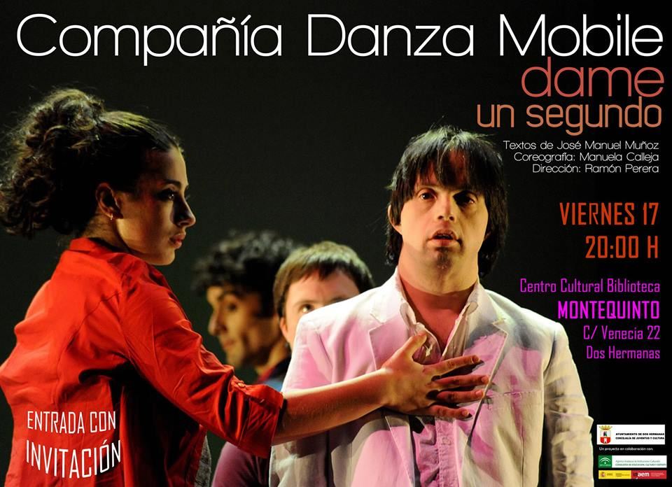 En el Centro Cultural-Biblioteca de Montequinto, tendrá lugar el próximo viernes 17 de octubre, a las 20:00 horas, ESPECTÁCULO DE DANZA ‘Dame un segundo’ a cargo de la compañía Danza Mobile; actividad que se enmarca dentro de la programación CIPAEM (Circuito Provincial de las Artes Escénicas y de la música) de la Diputación de Sevilla. (Entrada con INVITACIÓN)