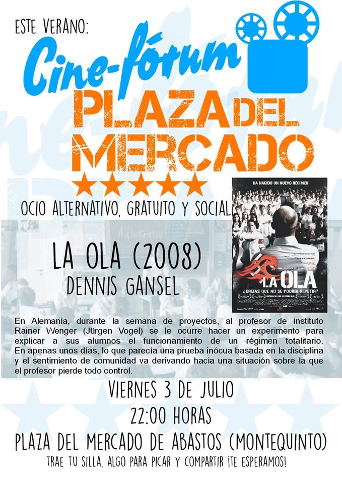El Cinefórum dará comienzo este viernes 3 de julio a las 22:00 horas en la Plaza del Mercado de Abastos, como bien reza en el propio nombre, y será con la proyección de la película alemana “La Ola” (“Die Welle”; 2008; más información: http://www.filmaffinity.com/es/film695239.html).