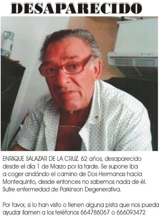 Hace apenas unos días pedíamos la colaboración de los vecinos para encontrar a Enrique Salazar, nazareno de 62 años enfermo de parlkinson que había desaparecido el Sábado 2 de Marzo cuando se dirigía desde Dos Hermanas a Montequinto en busca de ramas de acebuche para fabricar bastones como entretenimiento.