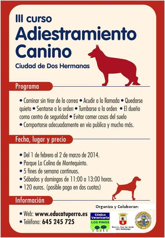Tras la grata experiencia que tuve el placer de vivir en el 2º curso de Adiestramiento Canino Ciudad de Dos Hermanas, me complace comunicaros que desde el 1 de Febrero hasta el 2 de Marzo tendrá lugar la tercera edición del Curso de Adiestramiento Canino Ciudad de Dos Hermanas impartido por el gran Álvaro Ortega, nuestro encantador de perros particular.