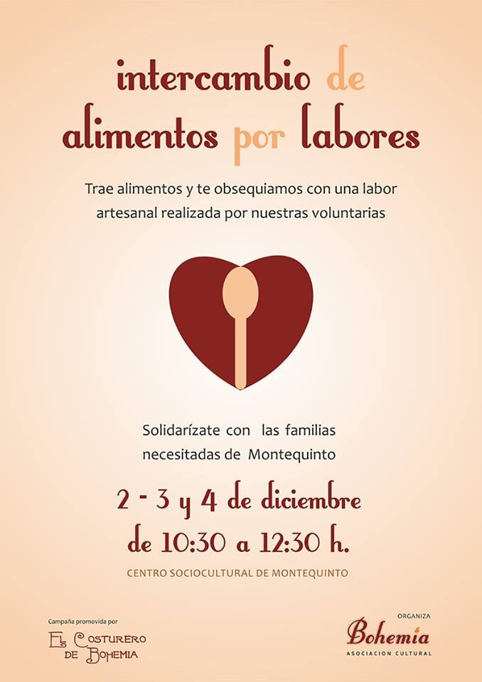 La Asociación Cultural Bohemia a través de su Tertulia «El Costurero», quiere unirse a la Gran campaña de recogida de alimentos «Navidad para todos en Montequinto«. Para ello y con el fin de gratificar a quienes colaboran, del 2 al 4 de diciembre en horario de 10:30 a 12:30, en el vestíbulo de la Biblioteca de Montequinto, harán un intercambio de las labores realizadas en su tertulia a lo largo del año por alimentos.
