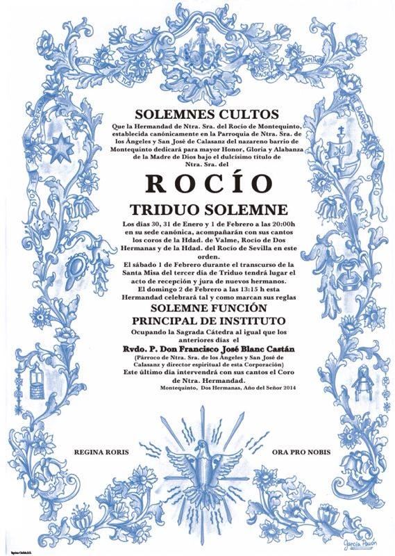 El Solemne Tríduo se celebrará en su sede canónica, la Parroquia de Ntra. Sra. de los Ángeles y San José de Calasanz, acompañádolos los coros de la Hermandad de Ntra. Sra. de Valme de Dos Hermanas, de la Hermandad de Ntra. Sra. del Rocío de Dos Hermanas y de la Hermandad de Ntra. Sra. del Rocío de Sevilla en este orden.