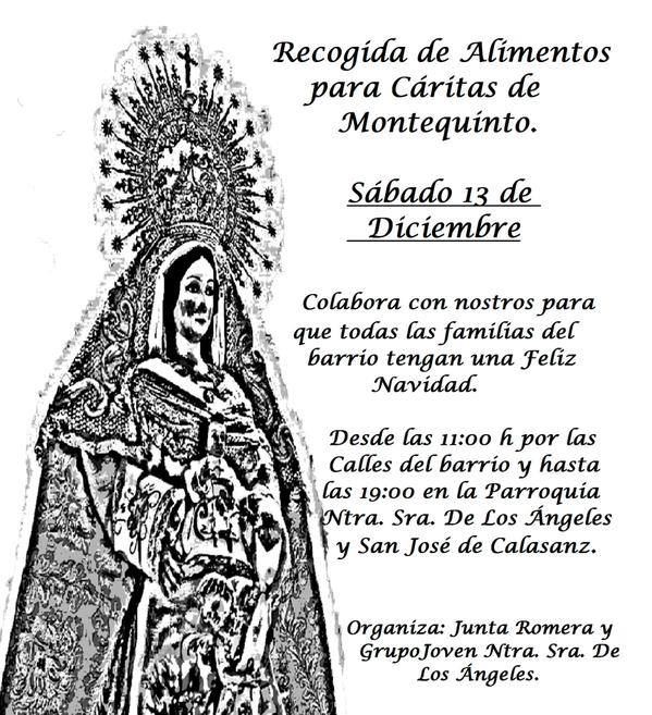 Como cada año la Junta Romera de Nuestra Señora de los Ángeles, Patrona de Quinto, realiza una recogida de alimentos para entregárselos a Cáritas de Montequinto, para que ninguna familia pase necesidad y tengan una feliz Navidad. El Grupo Joven de Ntra. Sra. de Los Ángeles , tras su reciente creación, colabora con la Junta Romera en esta recogida.