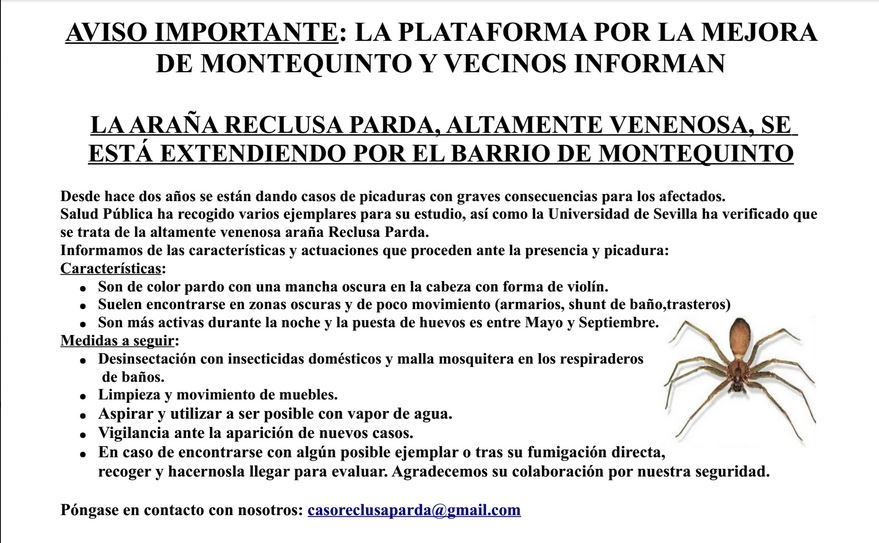 Durante el pasado fin de semana hemos recibido la alerta de multitud de vecinos que nos preguntaban sobre la presencia de la Araña Reclusa Parda en Montequinto, todo a raíz de un papel colgado en algunas zonas de nuestro barrio donde se informaba de la presencia de este venenoso animal y de las pautas a seguir en caso de picadura. Vivir en Montequinto ha investigando hablando con los creadores de la propia alerta, con los vecinos de Montequinto y con miembros de la administración, con la intención de aclarar este tema a la mayor brevedad posible debido a la alarma social que se está produciendo y al exceso de información, en mucho casos errónea que se está dando, sobre todo a través de las redes sociales.