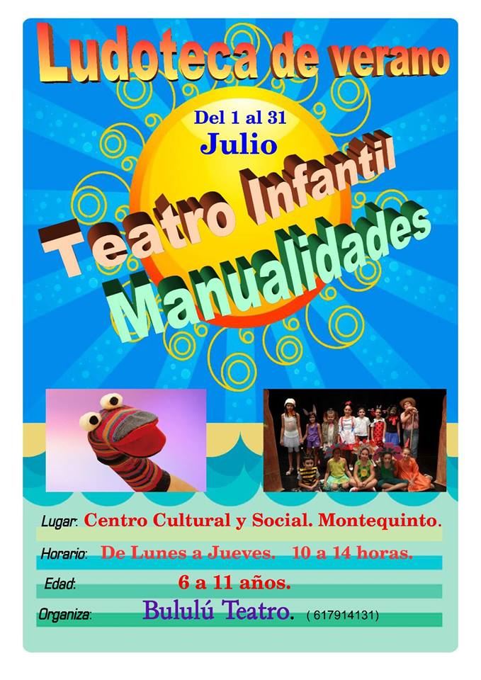Durante el mes de julio, de 10:00 a 14:00 horas, LUDOTECA DE VERANO con actividades de teatro y manualidades dirigidas a niños/as de 6 a 11 años, con Bululú Teatro (MÁS INFORMACIÓN: 617914131)