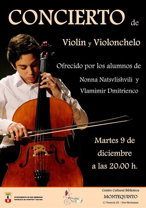 A las 20:00 horas, Concierto de música ofrecido por los Alumnos de Nonna Natsvlishvili y Vlamimir Dmitrienco, profesores y miembros de la de la Real Orquesta Sinfónica de Sevilla (ROSS),