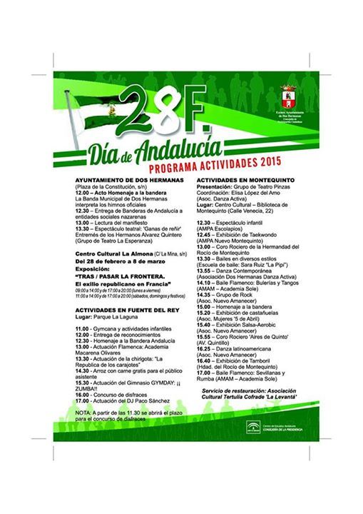 El sábado 28 de febrero, a partir de las 12:30 horas, el Centro Cultural Biblioteca de Montequinto acoge los actos de celebración del Día de Andalucía con un variado programa de actividades organizadas por la Concejalía de Participación Ciudadana en colaboración con diversas entidades ciudadanas.