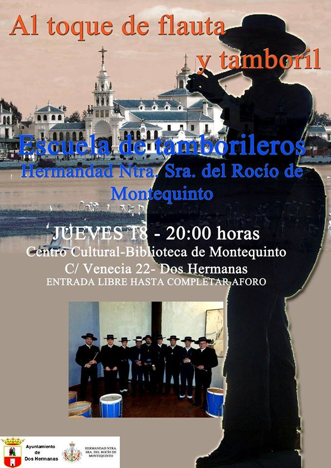 El jueves 18 de junio, a las 20:00 horas, en la Biblioteca de Montequinto, MUESTRA MUSICAL ‘Al toque de flauta y tamboril’ organizada por el Taller de Tamborileros de la Hermandad de Ntra. Sra. Del Rocío de Montequinto.