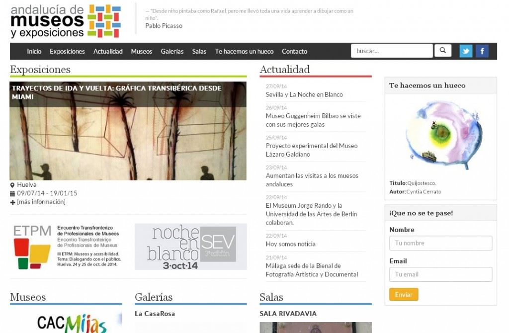 Nuestra vecina «Quinteña» Esther Fernandez, junto con Antonio Pereira, han creado recientemente una estupenda web, Andalucía de Museos y Exposiciones, www.andaluciademuseos.es. Es una web que ha sido concebida como punto de referencia de la cultura andaluza dando especial énfasis a exposiciones. Esta iniciativa trata de promover la conciencia cultural y ser lugar de encuentro para los amantes del arte. El proyecto pretende impulsar a artistas emergentes y exhibir arte desde una perspectiva diferente a partir de las posibilidades que ofrecen las nuevas tecnologías.