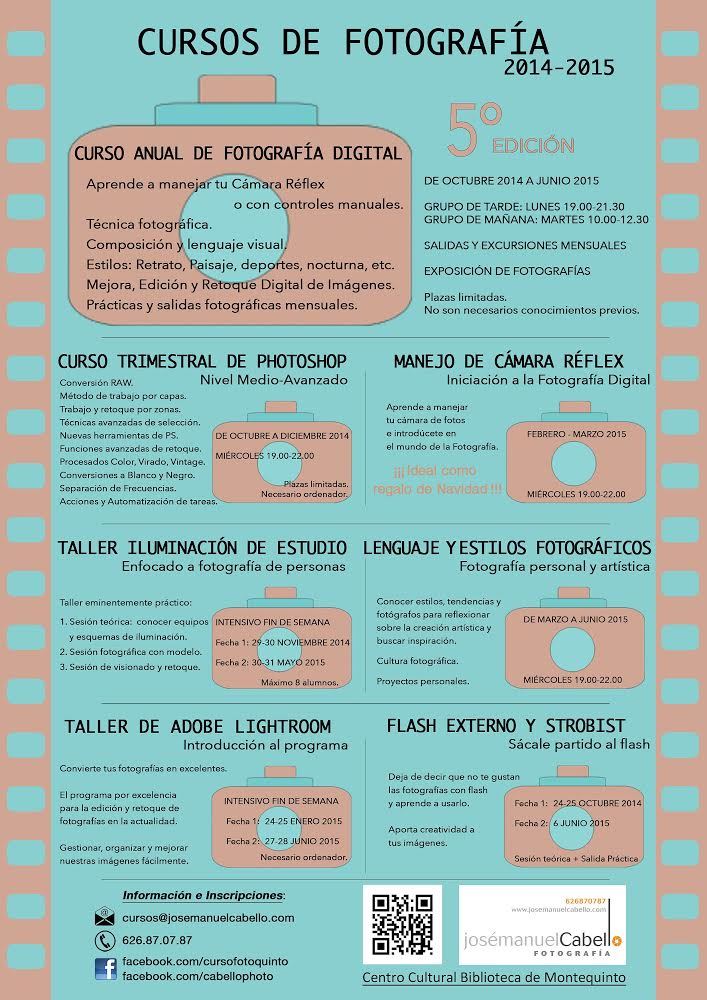Un año mas, y por cuarto año consecutivo, el fotógrafo quinteño Jose Manuel Cabello nos presenta sus cursos de fotografía digital. Estos cursos estan destinados para todos aquellos amantes de la fotografía tanto de nivel básico como medio, que quieran ampliar sus conocimientos y aprender a sacarle el máximo partido a su cámara Reflex.Estos cursos de dividen en: