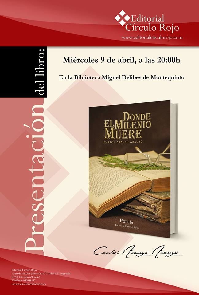 En el Centro Cultural-Biblioteca de Montequinto, tendrá lugar el proximo miércoles 9 de abril, el salón de actos el encuentro con el autor Carlos Arauzo Arauzo y la PRESENTACIÓN de su tercer poemario ‘Donde el milenio muere’.