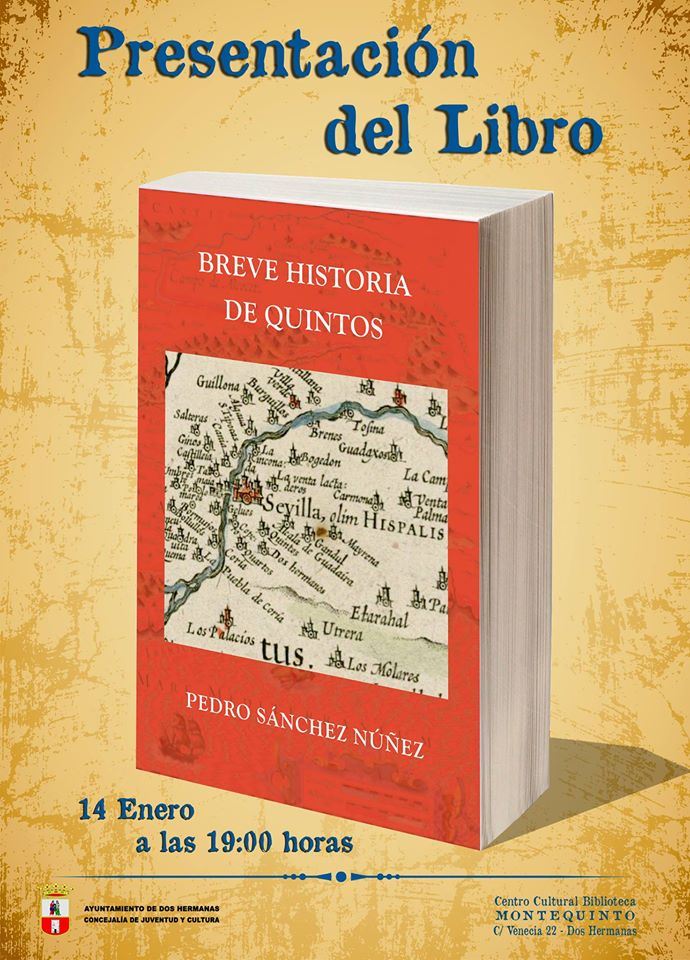 El próximo Miércoles, 14 de Enero, a las 19:00 h., en el Centro Cultural Biblioteca de Montequinto, tendrá lugar la presentación del libro «Breve Historia de Quintos», que narra la historia de Montequinto desde sus orígenes, escrito por Pedro Sánchez Núñez, cronista oficial de Dos Hermanas durante más de 40 años. (Entrada libre hasta completar aforo)