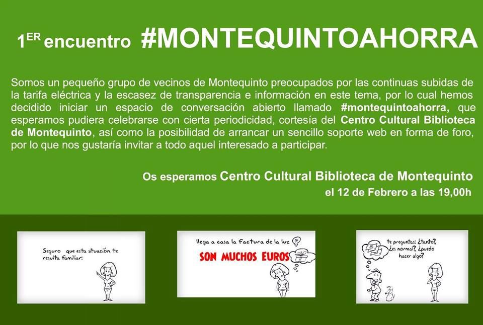 #montequintoahorra es un espacio de conversación abierto a la participación, compuesto inicialmente por un grupo de vecinos de Montequinto preocupados por las continuas subidas de la tarifa eléctrica y la escasez de transparencia e información sobre el tema.