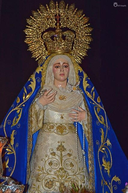 La Virgen del Pilar en su mayor dolor, obra de Jose María Leal Bernardez, ha tenido como madrinas a Hdad. de Santa Cruz de Dos Hermanas, que además le prestó sus andas para esta salida, a la Hdad. del Cachorro de Sevilla y a la Comandancia de la Guardia Civil, por su cercanía con el barrio quinteño.