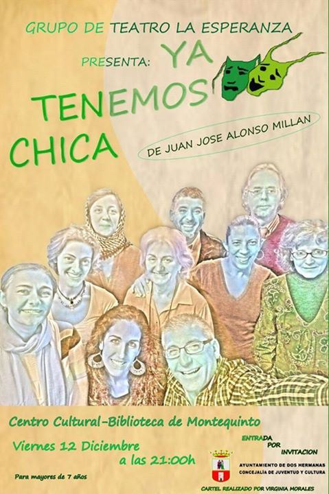 El viernes 12 de diciembre, a las 21:00 horas, en el salón de actos del Centro Cultural Biblioteca Pública Municipal «Miguel Delibes» (Montequinto-Dos Hermanas), Representación teatral de la obra «Ya tenemos chica» a cargo del Grupo de Teatro La Esperanza .