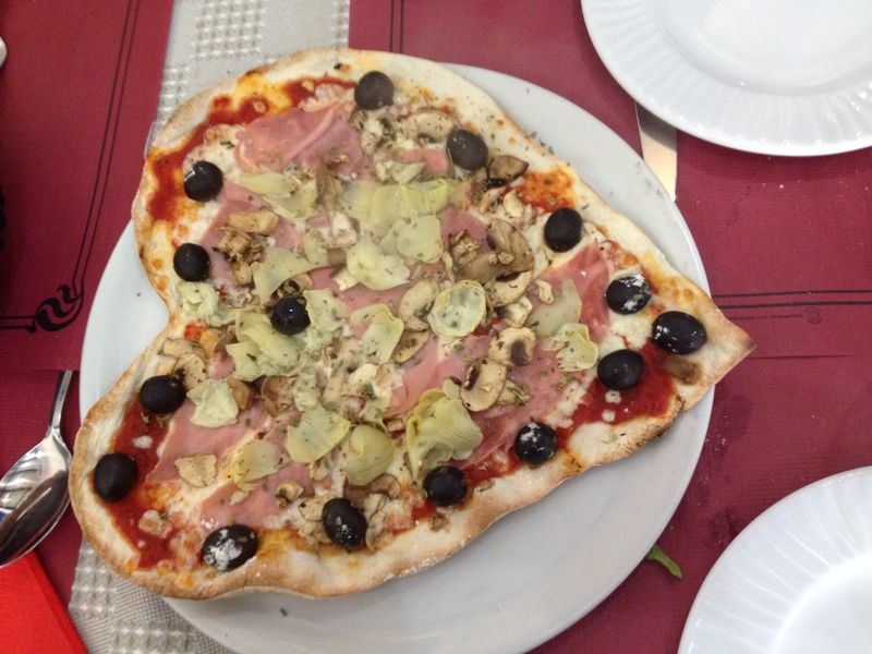 original y con la forma de un corazón, mas romántico no se puede ser, bueno si se puede, porque cuando nos pusieron la pizza ¡también tenía forma de corazón! Me encantó. La pizza como siempre estaba sublime, es uno de los puntos fuertes de este lugar, con la masa fina mas tradicional y con muchos ingredientes, riquísima.