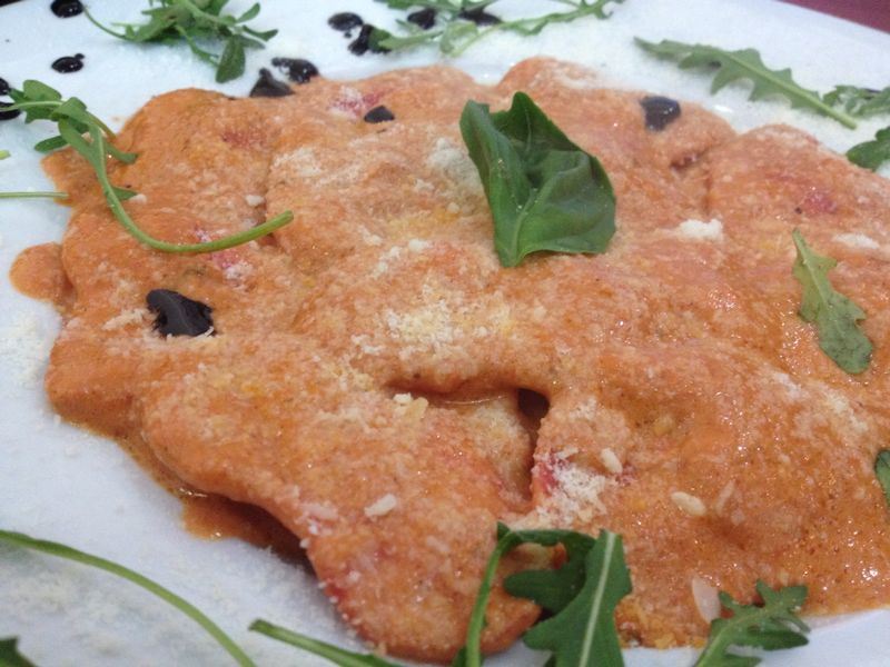 Los corazones de pasta rellenos de queso y albahaca estaban buenísimos, hechos por el chef y con un color rojo muy