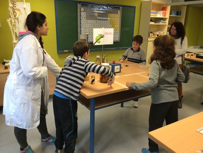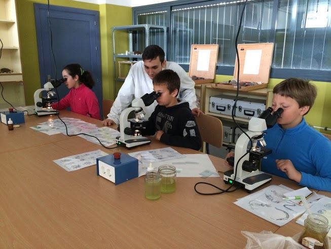 Una vez acabada la proyección y de la mano de voluntarios estudiantes de Biología del centro, los alumnos tenían la ocasión de visitar los laboratorios. El de Biología se había preparado para la observación de la vida microscópica de las charcas y para ello contaba con lupas y microscopios. Había también un microscopio que proyectaba sobre una pantalla tejidos animales y vegetales que los alumnos iban cambiando a su gusto. El laboratorio de química, por su parte, se organizó para llevar a cabo varios juegos basados en la identificación de restos de seres vivos como frutos, hojas, insectos, puestas, nidos, huesos y cráneos.