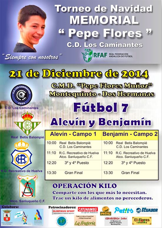 Un año más, C.D. Los Caminantes organiza el Torneo de fútbol en memoria de Pepe Flores, el niño de 13 años fallecido en un accidente en 2011 y que conmocionó tanto a su club como a todos los vecinos de Montequinto. Esta será la cuarta edición de este torneo que se celebra en el Complejo Deportivo Municipal “Pepe Flores Muñoz”, nombre que le concedió el ayuntamiento en honor al joven, el próximo 21 de Diciembre. Participarán equipos de alto nivel del fútbol base andaluz en las categorías de alevín y benjamín.