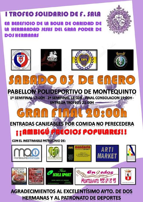 El próximo 3 de Enero, se celebrará en el Pabellón Deportivo de Montequinto, el I Torneo Solidario de Fútbol Sala en Beneficio de la Bolsa de Caridad de la Hermandad Jesús del Gran Poder de Dos Hermanas.