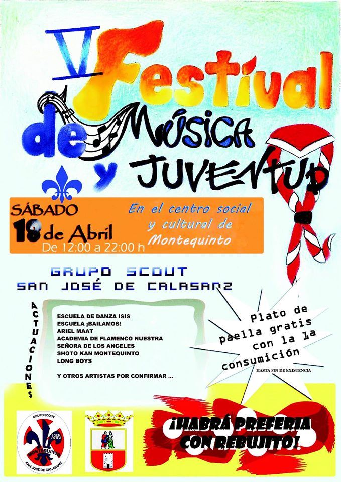 El sábado 18 de abril, a partir de las 12:00 horas, el grupo Scouts Montequinto MSC celebrará la 5ª edición del «FESTIVAL DE MÚSICA Y JUVENTUD’, evento que viene organizando desde el año 2011 en el Centro Cultural Biblioteca de Montequinto (Dos Hermanas).